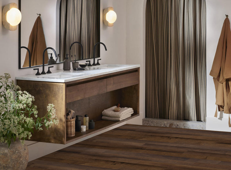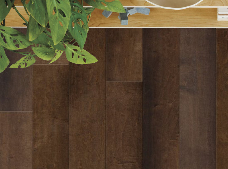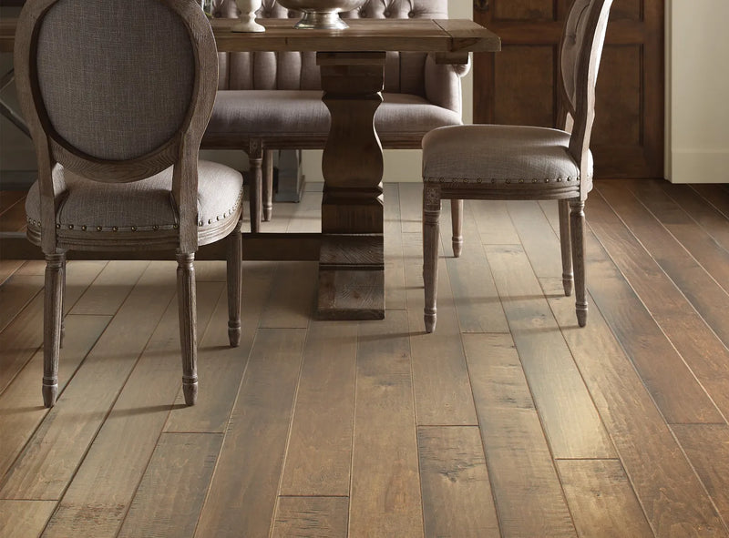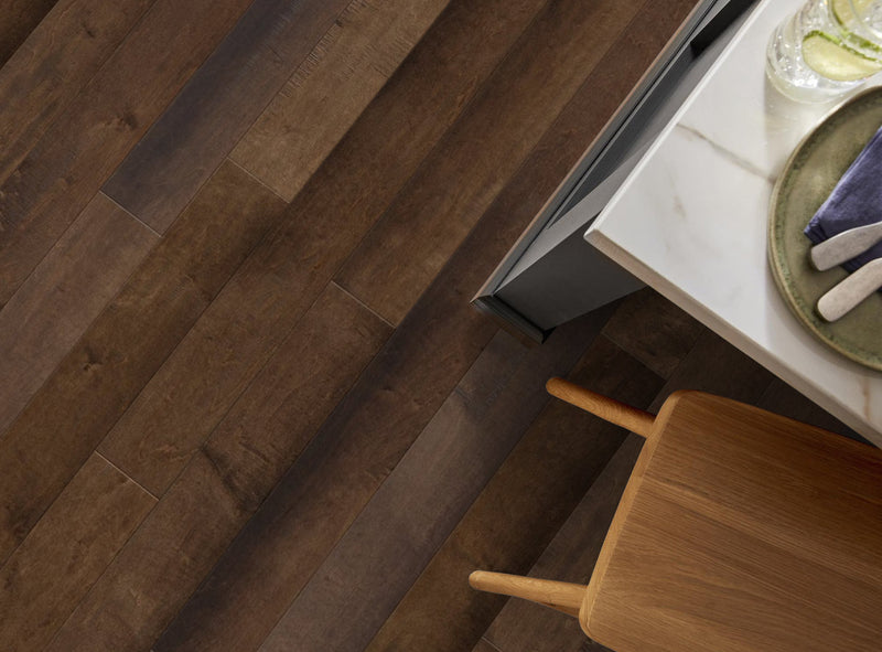 No matter what style or tone you're going for in your home, there's a color that will work perfectly for you - be it an on-trend light natural or a timeless, rich darker tone. This is one of our most popular hardwoods thanks to its ability to blend so easily into any environment. It's scraped and comes in a 5" plank that's guaranteed for 50 years. For those that want more rustic, grain-heavy lines, look at the companion Bernina Hickory style for texture and detail. For a cleaner, more polished look try the Bernina Maple.