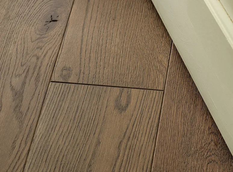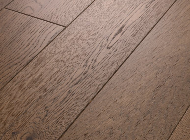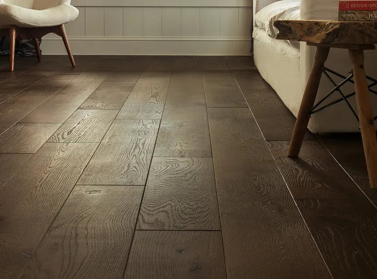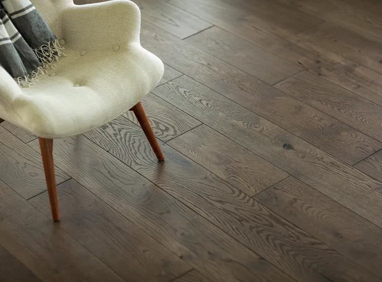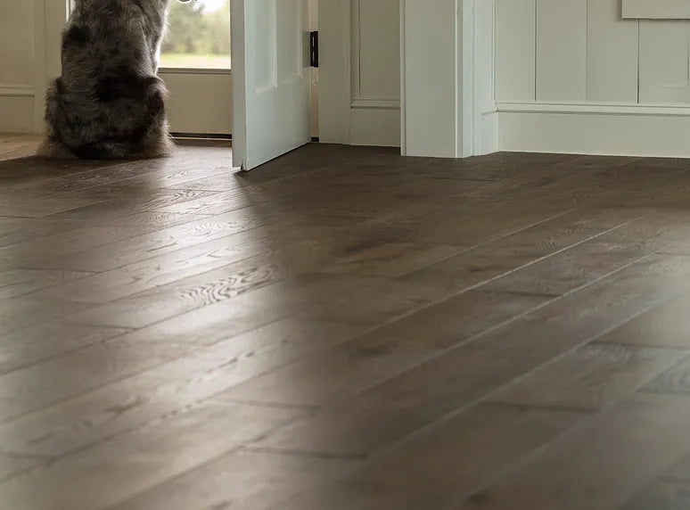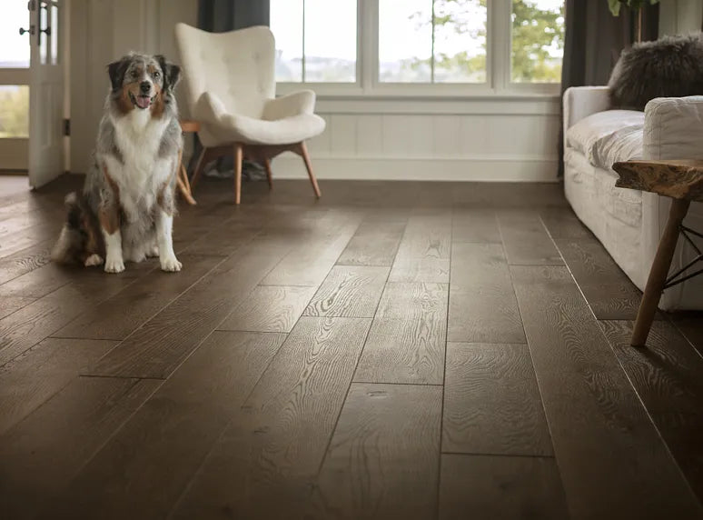 When designers set out to create a hardwood line with the perfect color palette, Buckingham and Kensington are your results. Each color was created with its own unique multi-layer staining process until it was the perfect shade. We chose Buckingham for our Unleashed line because its beautiful colors, impressively wide 8” planks and wire-brushed texture are the perfect transition between carpets. This style is a nominal 5/8" thickness. The durable White Oak can take any and all pet or human traffic, and the six warm tones blend well with the pet-friendly carpets when they’re used as area rugs. For cooler tones, check out Kensington.