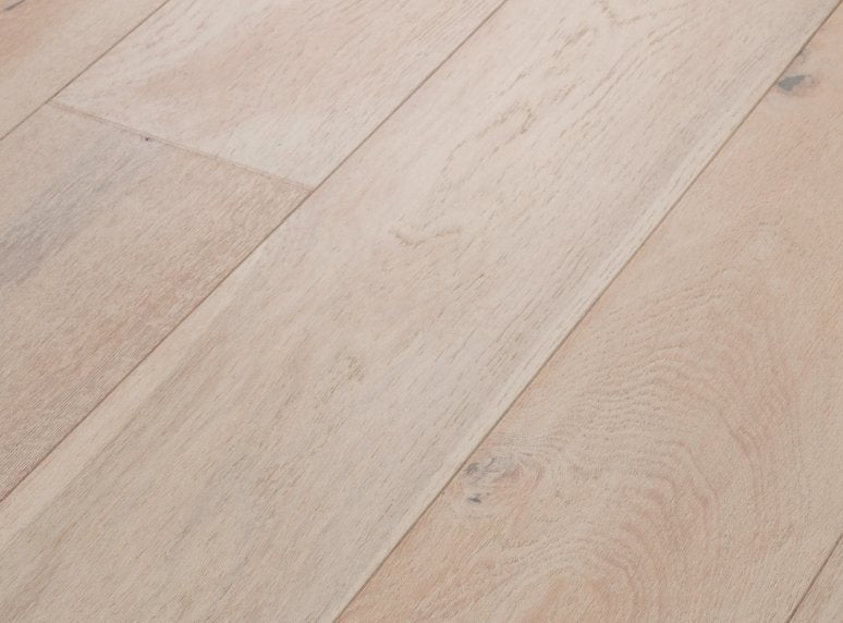 Serene tones and time worn textures elevate the character of this European Oak hardwood. Every 7.5-inch plank is carefully brushed, painted, then sanded to achieve a crafted finish with the natural essence of weathered painted wood.