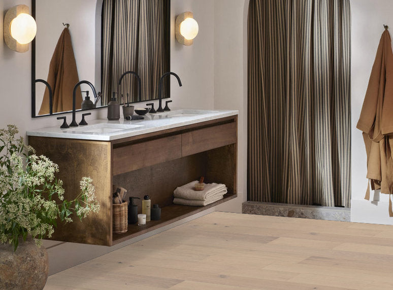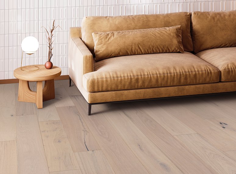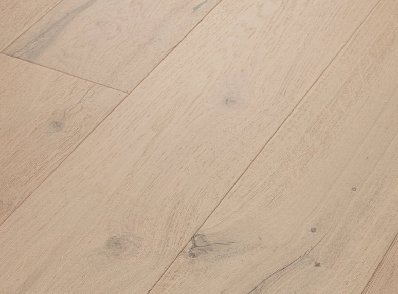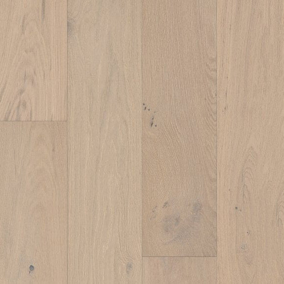 Serene tones and time worn textures elevate the character of this European Oak hardwood. Every 7.5-inch plank is carefully brushed, painted, then sanded to achieve a crafted finish with the natural essence of weathered painted wood.