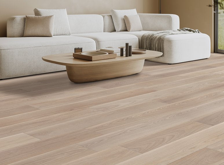 Indulge in the natural tranquility of clean lines, rippling grain, and grounding color transitions; European Ash hardwood infuses serenity into your sanctuary. Carefully crafted to accentuate its natural graining, this style is also available in a herringbone installation option for enhanced design versatility.