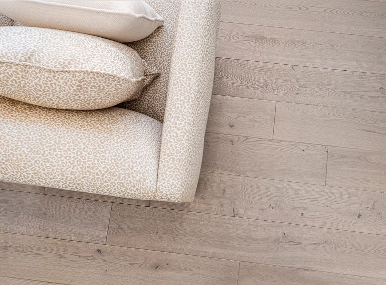 With Metallics II, every step brings a sense of wonder. Created with a stain infused with metallic powders, each plank subtly shimmers - reminiscent of sunlight on a calm lake. Crafted from white oak, painted and wire brushed for a textured finish, these floors leave a lasting impression.