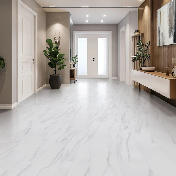 BIYORK HydroGen 6 Tile in River captures the natural flow of stone with cool grey undertones and gentle veining. This waterproof SPC tile blends organic beauty with modern performance, featuring a durable 6 mm core and attached underpad for comfort and quiet underfoot. Perfect for bathrooms, kitchens, and entryways, River delivers timeless sophistication with easy click-lock installation.