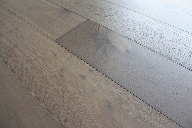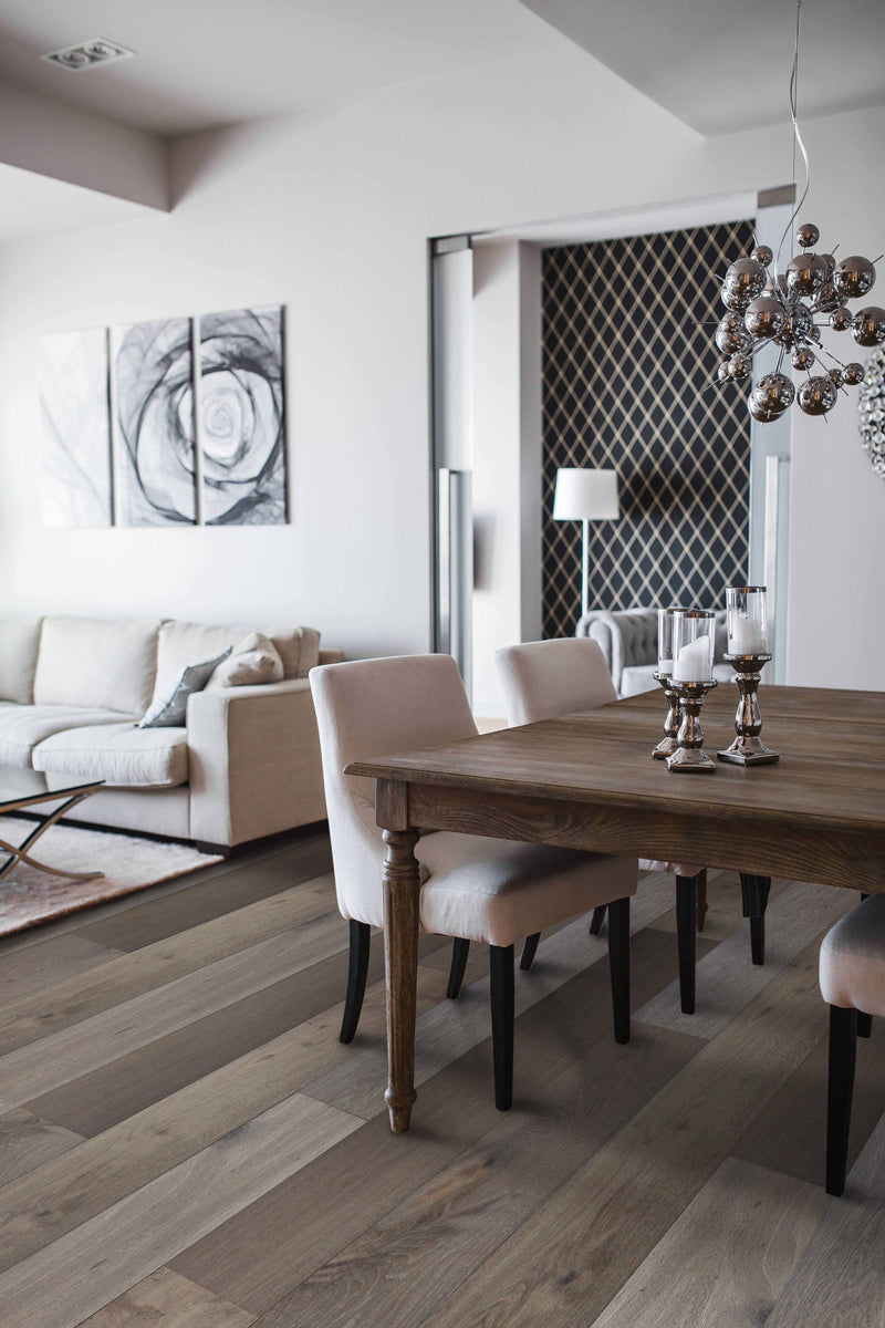 Homeowners who love golden brown hues can consider buying Collage Pravada engineered hardwood flooring. Pravada's Canvas Collection offers homeowners a perfect blend of mocha, Smokey grey, and ash brown tones. These 9.5-inch-wide wire brushed planks that have been double smoked offer a classy high-end golden-brown finish rare to find in any engineered hardwood floors on sale today.