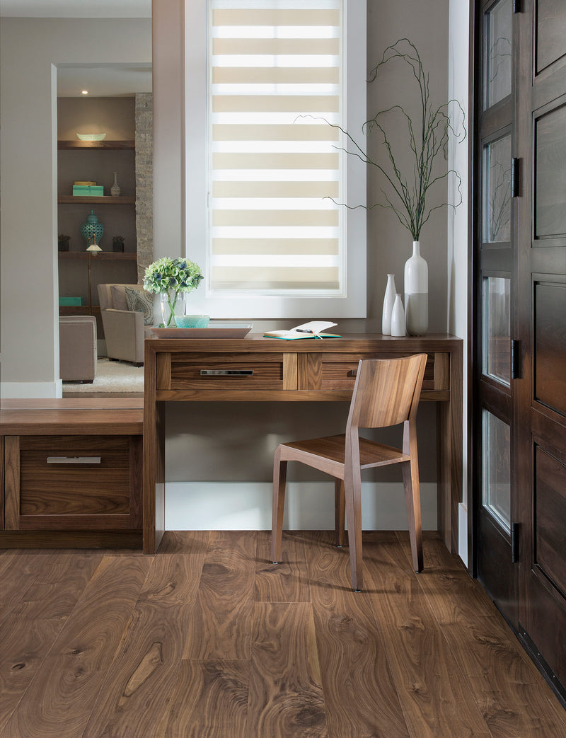 Segovia’s textural qualities and exotic grain pattern result in an organic, yet sophisticated look that enhances both traditional and modern interiors. When Black Walnut exists in the raw, completely unfinished form, it exhibits beautifully distinctive cool brown natural tones. Unfortunately, this colour is soon transformed whenever a finish is applied. In developing Segovia, we overcame this colour-change problem with a special hand-applied surface treatment that captures Black Walnut’s raw colour palette in the form of a finished floor.