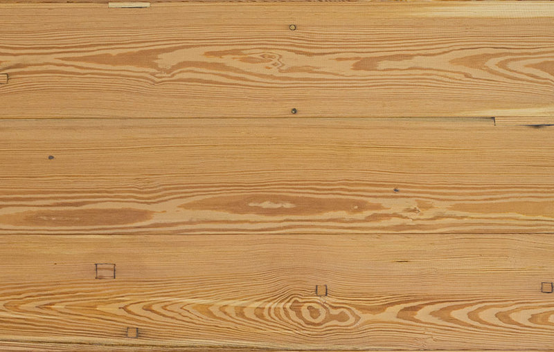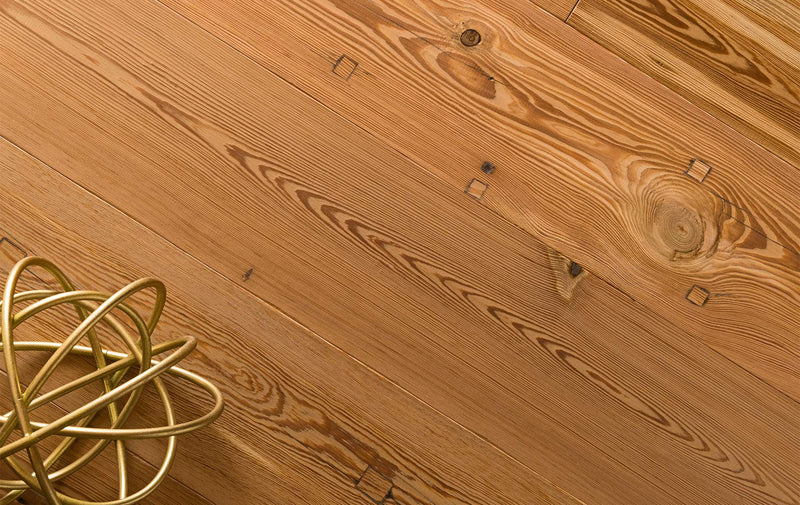 CRAFT Reclaimed Heart Pine collection offers 100-year-old, genuine reclaimed wideplank pine floors. This collection of authentic reclaimed floors features artisan-crafted Heart Pine made from century-old beams and decking salvaged from historic buildings across rural America. A number of authentic features can be observed such as nail holes, wood plugs and patches, chiseled bevels as well as a pronounced grain pattern. With its natural aging and slow growth, the wood has acquired beautiful golden auburn hues and a rich patina. A unique collection like this preserves a time from the past that can be cherished by future generations.