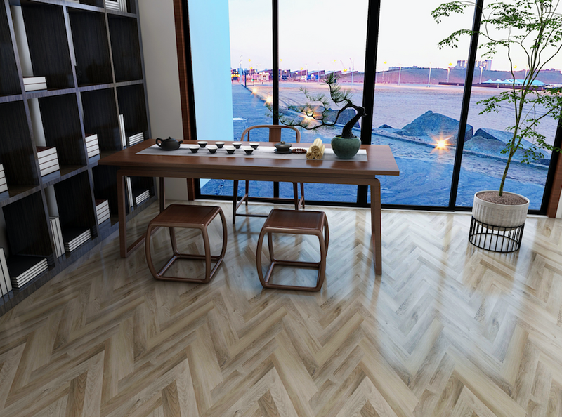 Sand Castle from the Herringbone Athens Vinyl Plank flooring collection, by HTBC Cyrus Floor. This features a four-sided click-lock system that creates a distinctive pattern. It's the stylish upgrade to traditional vinyl plank that's got all the benefits - scratch-resistant, water-resistant, and durable.