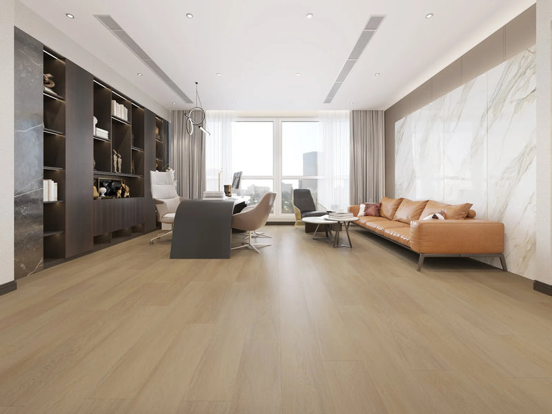 The collection features a durable, waterproof WPC (Wood-Polymer Composite) core, providing superior stability and comfort underfoot. Each plank is extra-long and wide, creating a spacious, modern aesthetic. Though the build is equivalent to a 10 mm plank in strength, the lengthened dimensions deliver elegance and a sleek look—ideal for both residential and light commercial spaces.