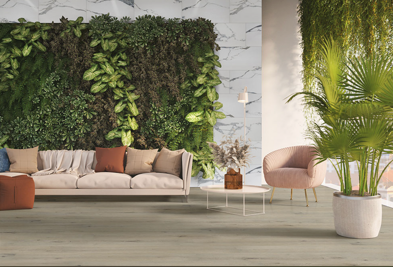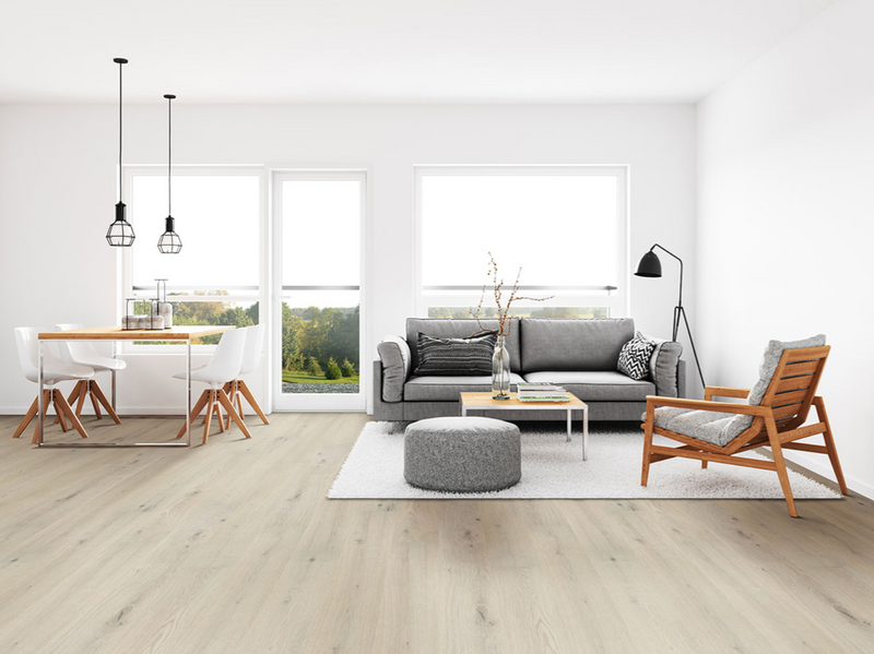 Incorporate Runmill Isle Luxury Vinyl Planks to any room featuring elegant ashy blonde hues with subtle knots and grains for an authentic wood look.