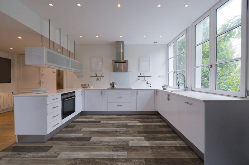 Incorporate Stable Luxury Vinyl Planks to help offer a palette of light and dark brown tones for an authentic antique hardwood appearance.