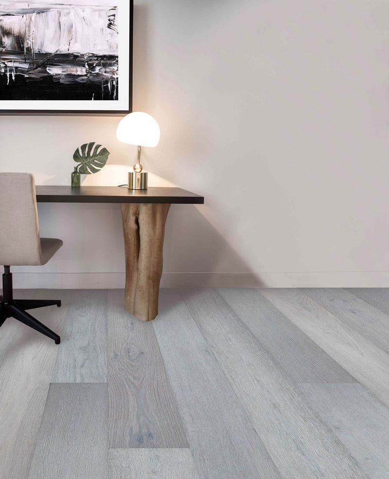 Pravada Decor Collections engineered hardwood flooring offers great light warm grey shades. The 7.5-inch planks made from European White Oak provide a natural stone look and feel. When you consider the hints of beige and other variations, it's obvious why Eames Pravada flooring is the engineered hardwood floor of choice for homeowners searching for interesting and dynamic flooring.