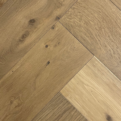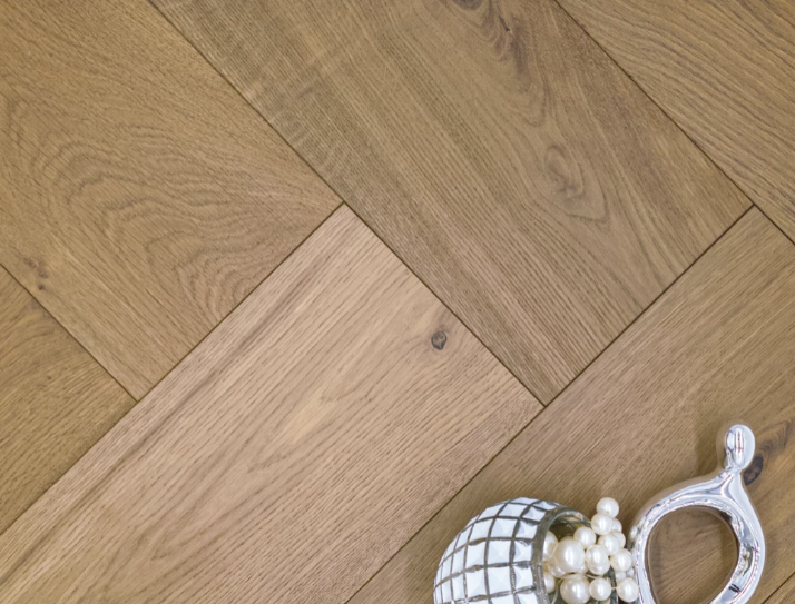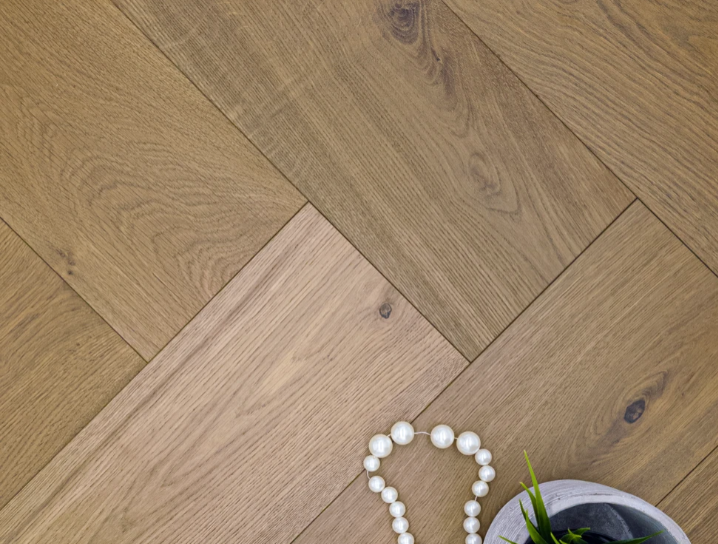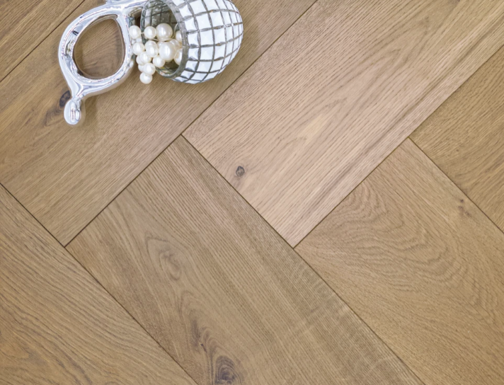 PRAVADA LE RÊVE COLLECTION AURORE is a sunrise of light and medium brown with smoky grey undertones that accentuate the beauty of the wire brush texture. A world of possibilities, brought to life in European White Oak 7.5" wide herringbone designs.