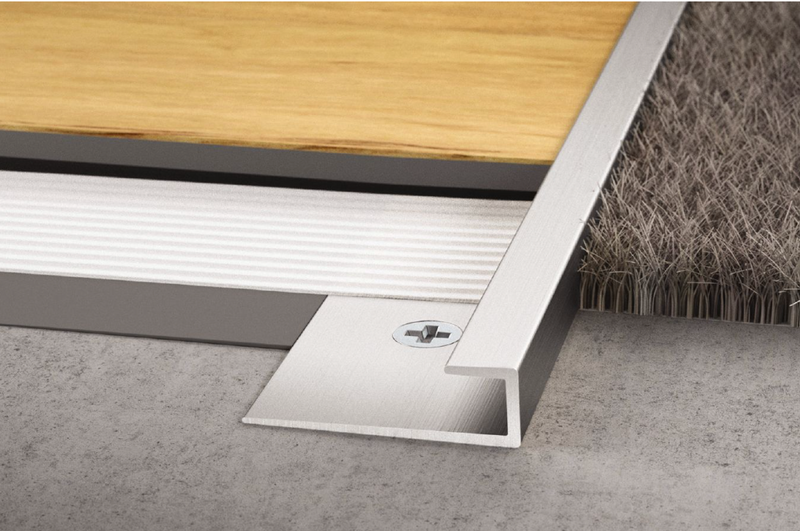 The profile Schluter-VINPRO-S will typically be used to finish vinyl flooring along the edge of a floor of similar height or in baseboard finishing applications. It provides a minimal, unobtrusive visible surface that complements the flooring, while providing transition and edge protection.