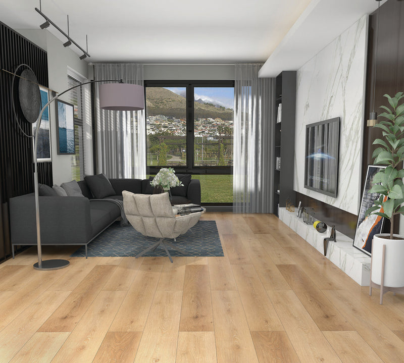 Quieter strength. A stone polymer core, wider plank flooring with an attached pad.