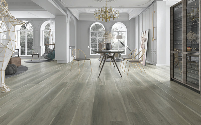 Quieter strength. A stone polymer core, wider plank flooring with an attached pad.