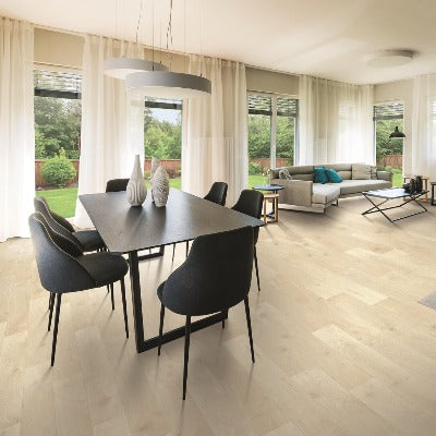 The cool shade of Sweet Cream Oak from TORLYS Leuco Collection has a gorgeous hardwood design, a 2mm connected pad for greater sound absorption, and an easy-to-clean surface that can even be damp mopped. TORLYS Leuco is a lovely collection of delicate oak designs, each with an attached pad for added sound absorption and comfort. It has a neutral color scheme and clean oak designs.